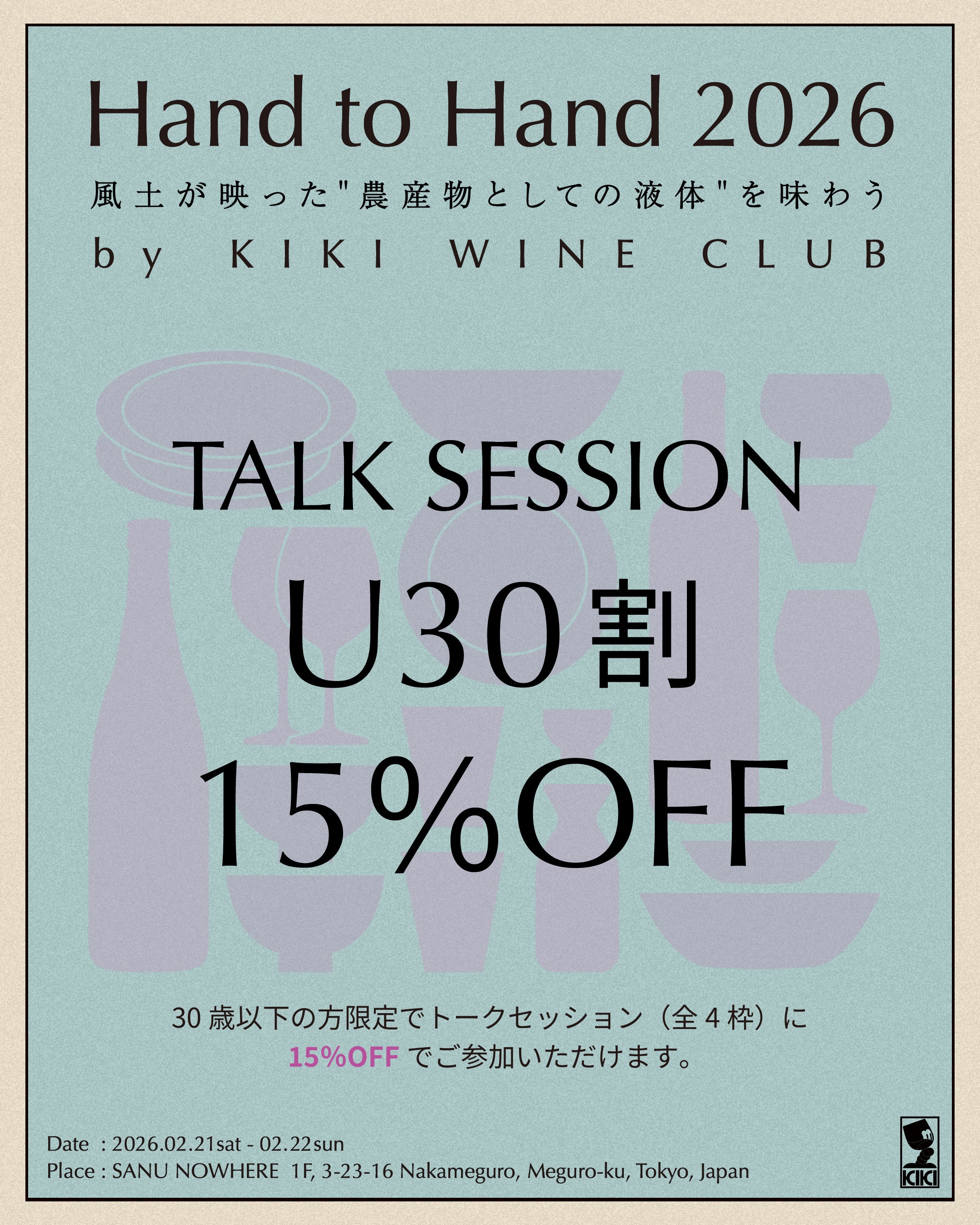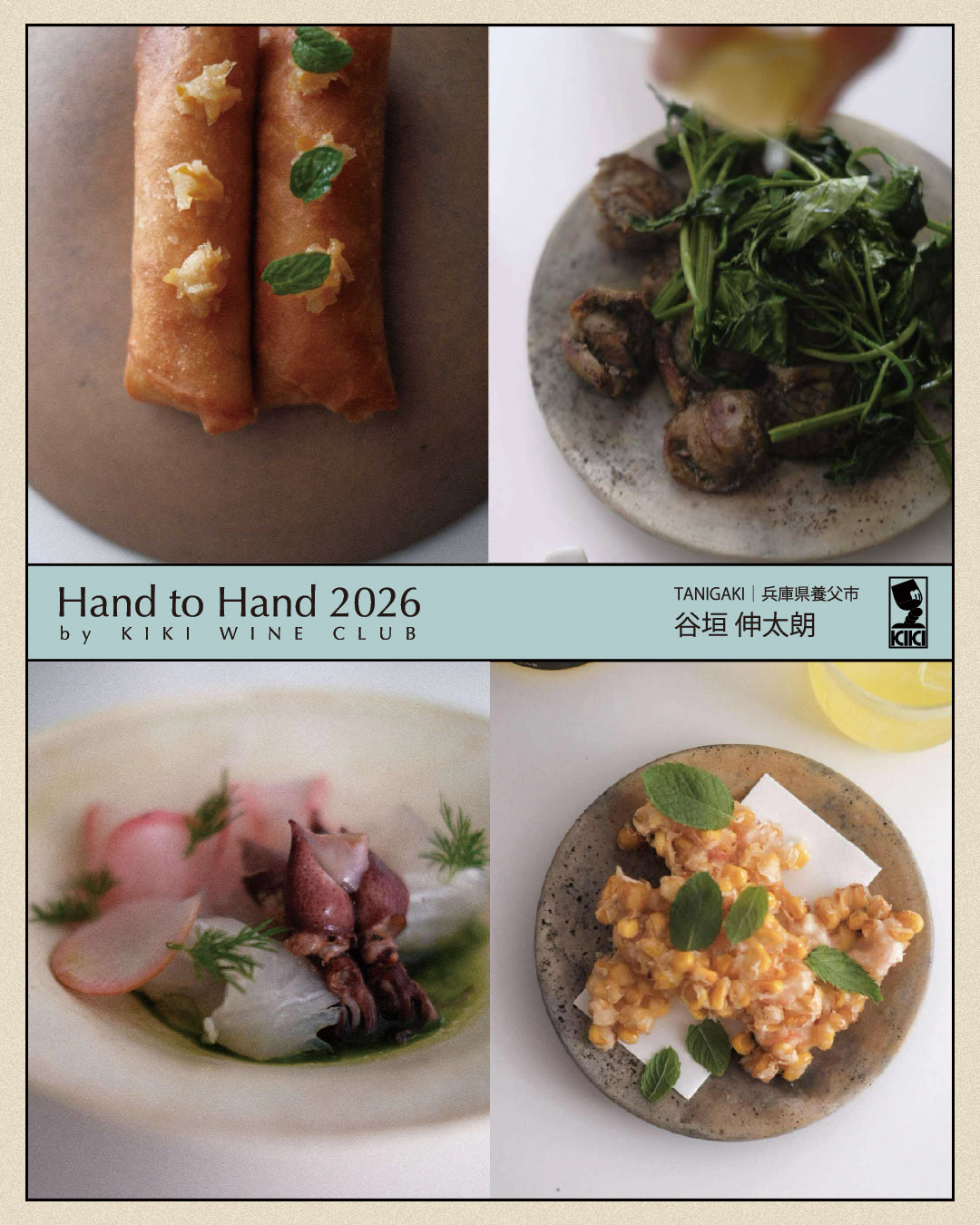 2026年2月21日(土)22日(日)の2日間、「手から手へ。生産と消費の循環が育む、私たちの食文化。」をコンセプトに、日本中から集まった醸造家とともに、KIKI WINE CLUB主催のワインイベントを開催します。ワインや焼酎、日本酒を飲み比べながら、 兵庫・養父市のレストラン"tanigaki"の谷垣伸太郎シェフ、兵庫・城崎市のレストラン"off"の谷垣亮太郎シェフによるスペシャルなコースをいただきながら、トークセッションをお楽しみいただけます。